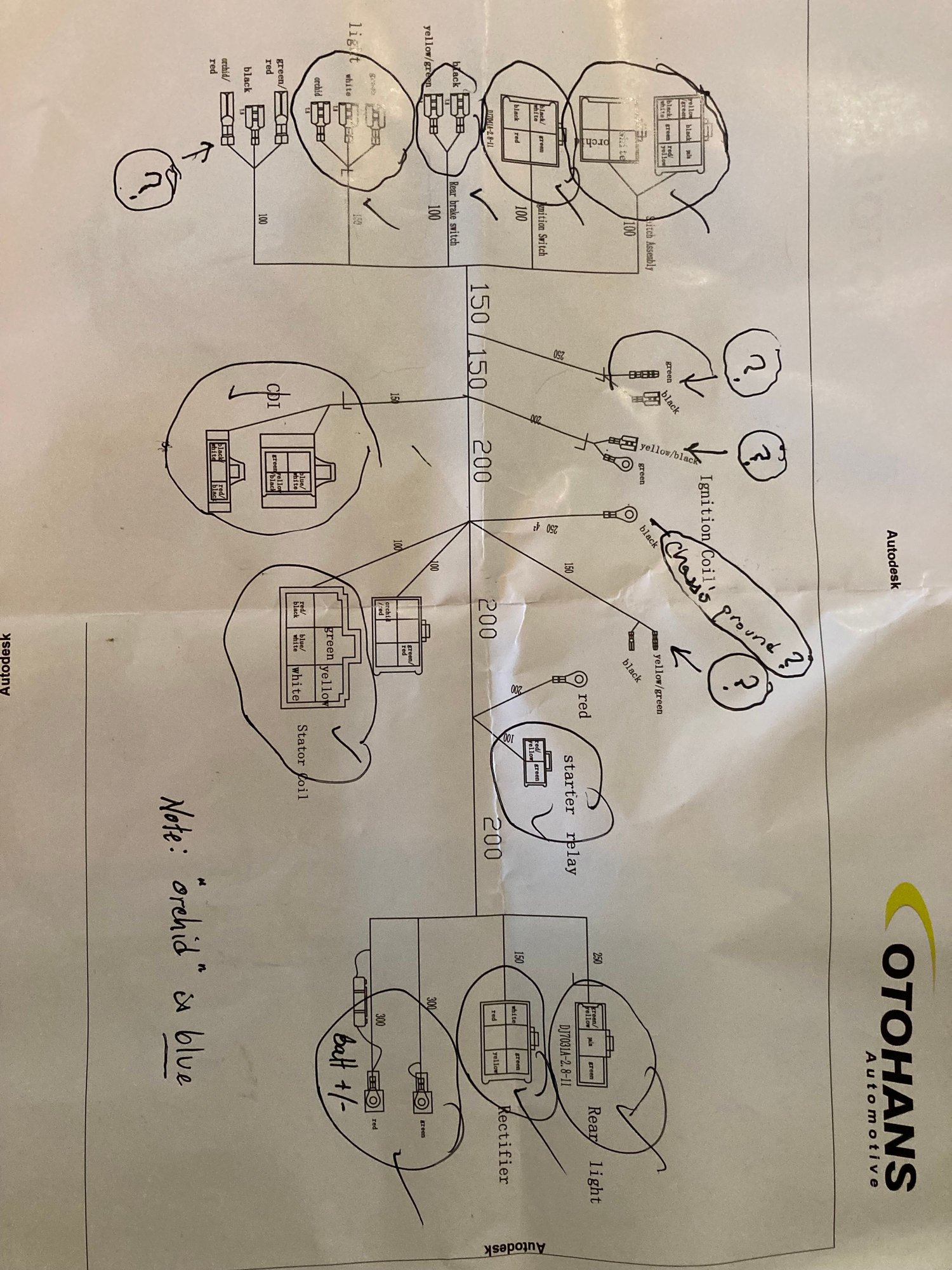 Hey folks, I purchased a new wiring harness with components for my Zongshen 250. I'm having a few issues. First, it will start when I jump the solenoid. Yay. It wont from the switch. I have attached pictures of things I couldn't identify identify from the wiring schematic. Also, there was a small square black box on it that also feeds to the horn but I see no connector that matches (has a bunch of wires and a 9 pin connector as well as the wires to the horn.) Can anyone help me identify the ones I labeled with a "?" and also, let me know if there are any wires I need to connect to bypass a safety switch or other?