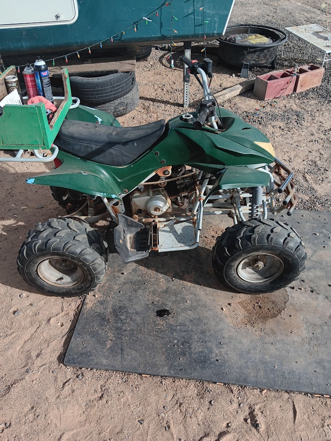 Those front shock mountings are fairly unusual, seems to have two alternative top mountings. Otherwise, the standard plastics and Honda Cub clone engine are used by many makers. Pity someone painted the plastics, it never sticks to the soft plastic used on ATVs, for long.