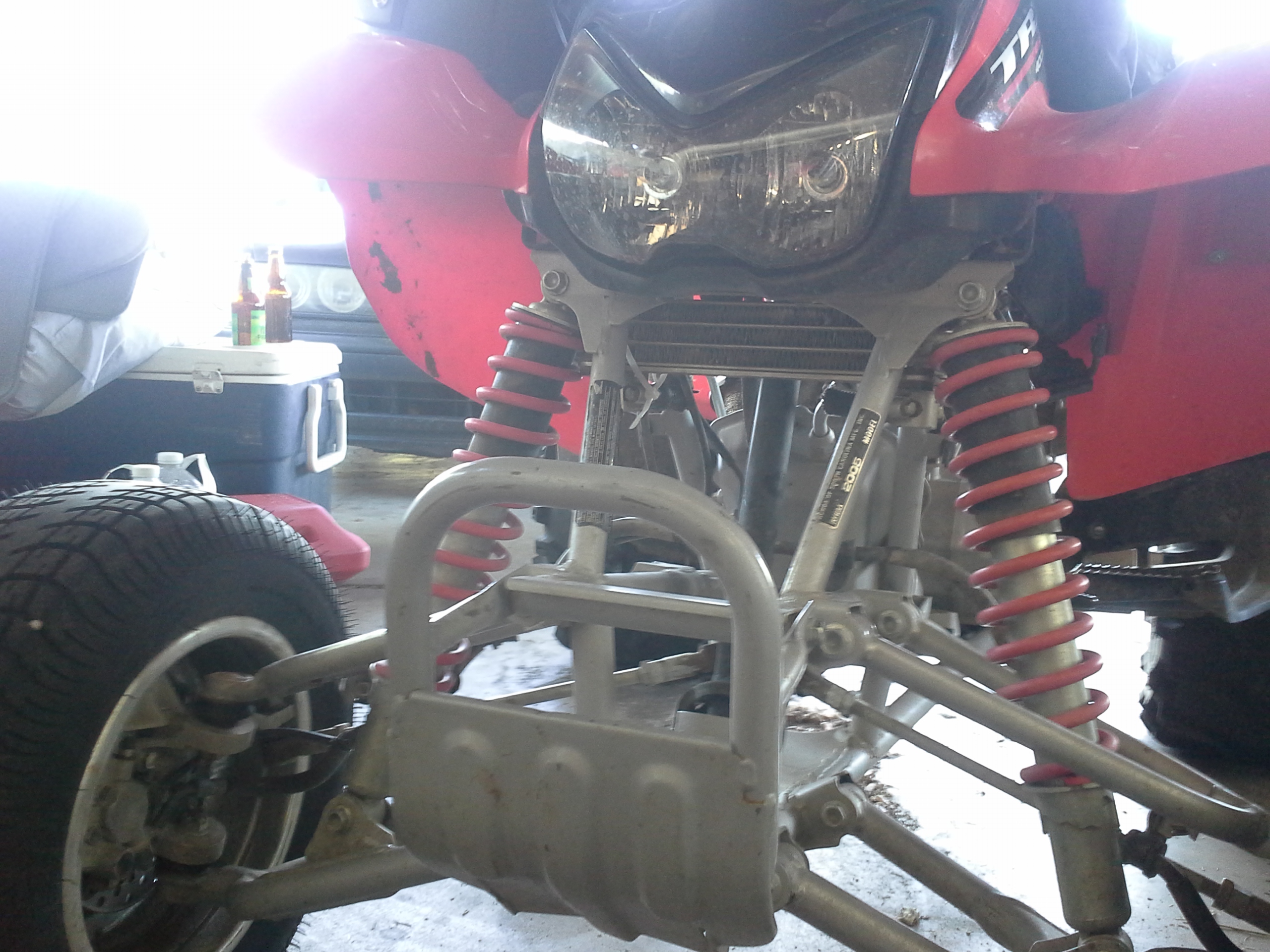 I've been daily-driving a 2005 400ex for a year now and it needs some extra cooling for street driving. I have an extra oil cooler from a 250ex, which appears to be the exact same thing, just one row shorter. My plan is to run the out from the 4 row cooler to the in of the 3 row, then out the 3 row back to the oil tank. This would give a 75% increase in cooler size, but im worried about pressure loss. Anyone have some experience with this? I mocked up the cooler where i want to mount it;