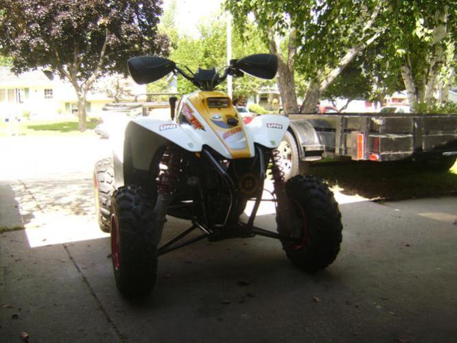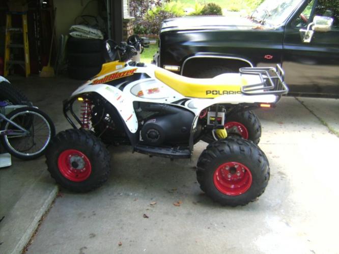 after a summer of riding a 350 rancher he says it isnt that fun i need something i can jump and toss around i need a sport quad. so after searching around and looking at a bunch I found a 02 trailblazer, not a spot of rust,original tires still got 90% of the tread, has very low hours owner stated wasnt used the last 3 years, came with a rear rack,cover,helmet,rear bag for rack and a windshield.