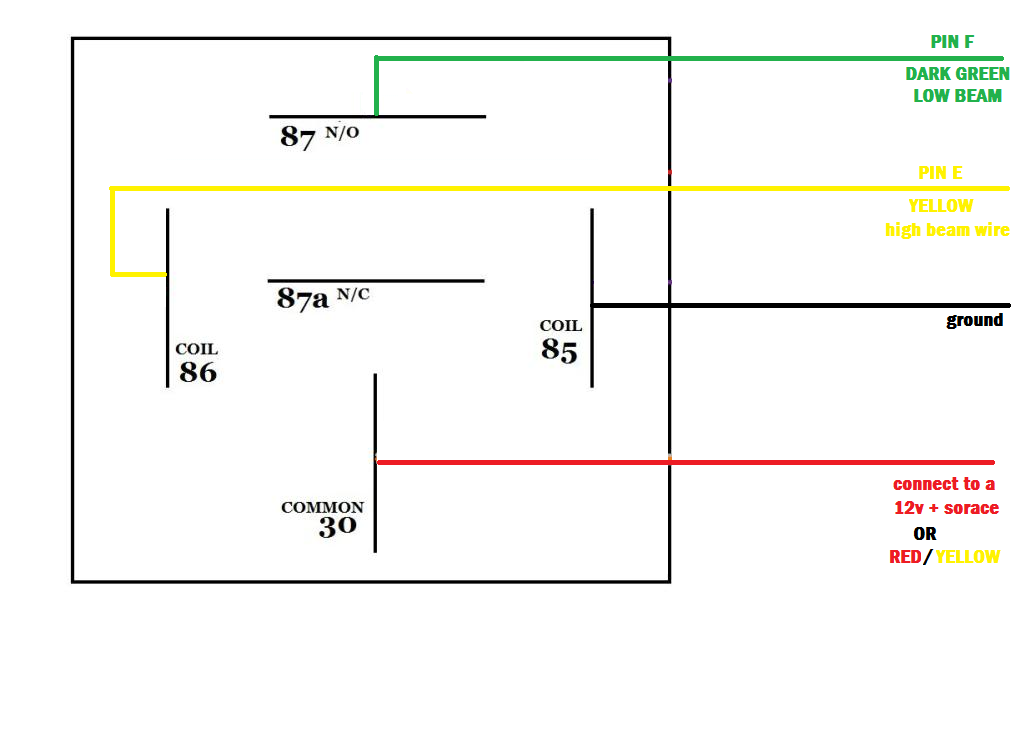 Three headlight mod- you will need a common relay from an auto parts store(I used a five pin because they are most common and came with a wiring harness), four 8" pieces of wire, and splice connectors. With the headlight pod off and the two harnesses unplugged you will need to splice the followoing wires: