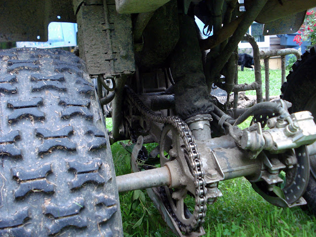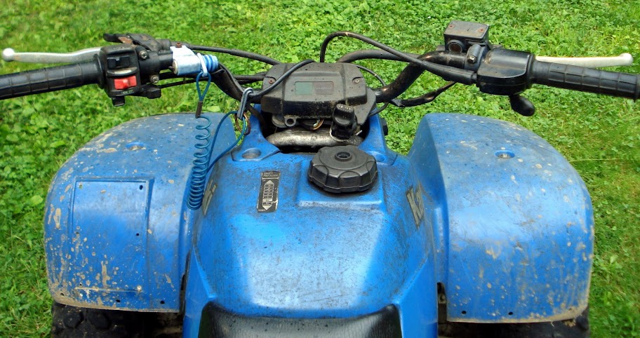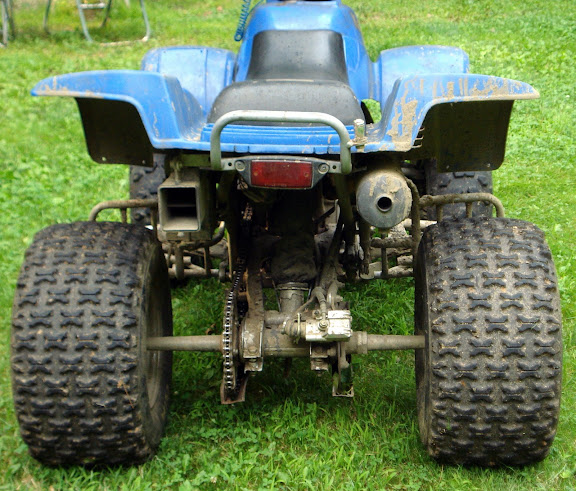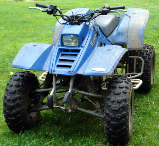 2001 Kawasaki Lakota Sport 300... morals of the day: always have your chain at the proper tension, and keep sport ATVs on the trails. This was taken shortly after towing it back to the house after the incident. Unfortunately we have nowhere to shelter our ATVs so they sit out in the rain. $30 for a transmission cover, $75-ish for an O-ring chain, and oil and filter later, it's back in commission, cleaner, and thanks to Star-Tron, starting better (even though it's always been a very good starter, and smooth-runner... this is my all-time favorite engine). I've since purchased mud flaps for it. I received it without mudflaps and tool kit/owner's manual.
