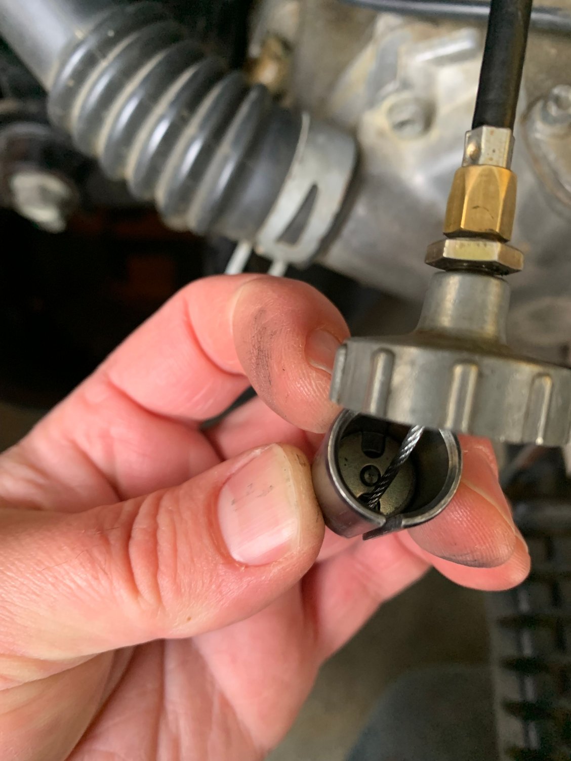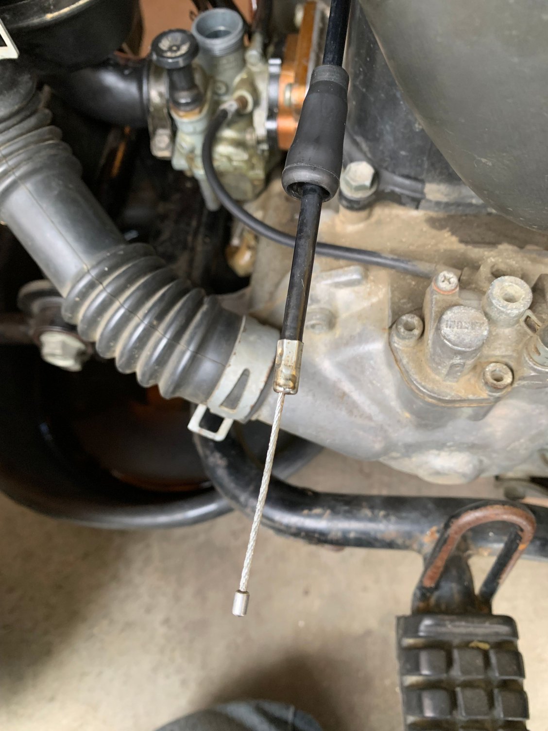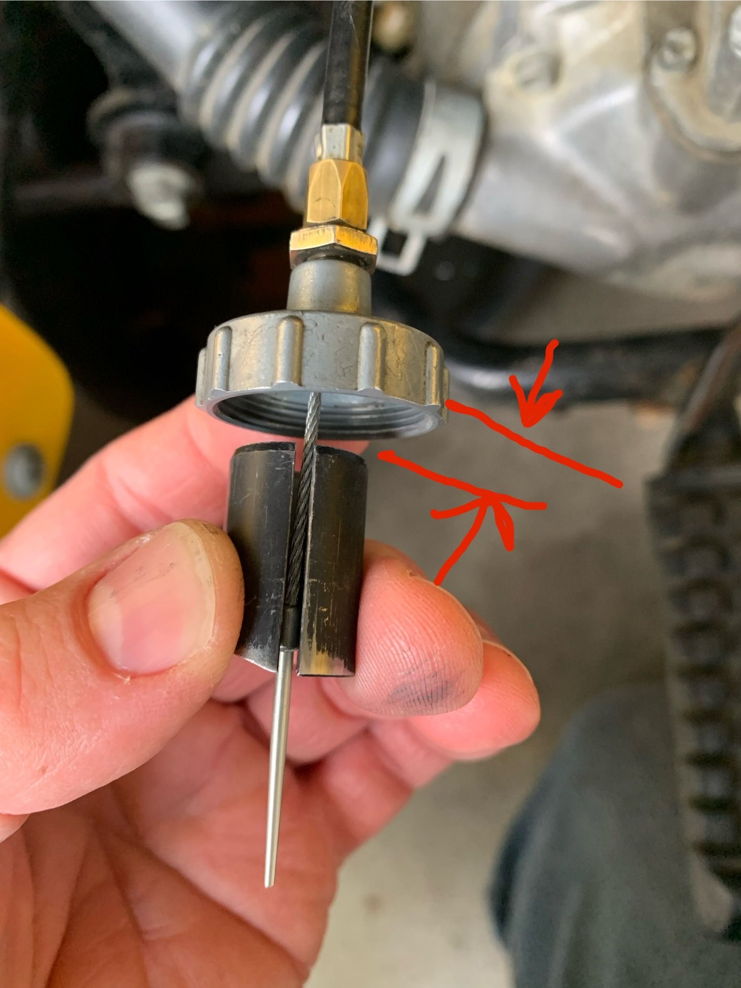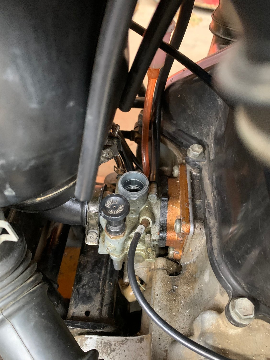 This space here is all that the thumb throttle will move. The adjuster screw at the thumb throttle is backed all the way out so unfortunately that’s not the problem. If I just drop the slide down in the carb it goes all the way down inside and bottoms out. I thought the throttle cable was the exact same length as the old one… before I threw the old one away 🙄. I can’t think what else it could be.