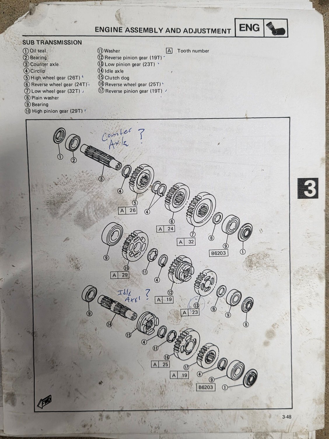 Ok so I'm not new to ATV's, but definitely new to working on them. Everything so far has been pretty good with rebuilding the engine, but I've got to the sub-transmisson and I'm lost. I bought a service manual for it but it's pretty vague and not very clear on this particular section. So any help would be absolutely appreciated. I've included pictures of the housing and one of all the gears. Also included the few pages of instructions that has me all confused. I just need to know which gear goes where, as well as the two axles. Again thank you so much in advance for any help and information.